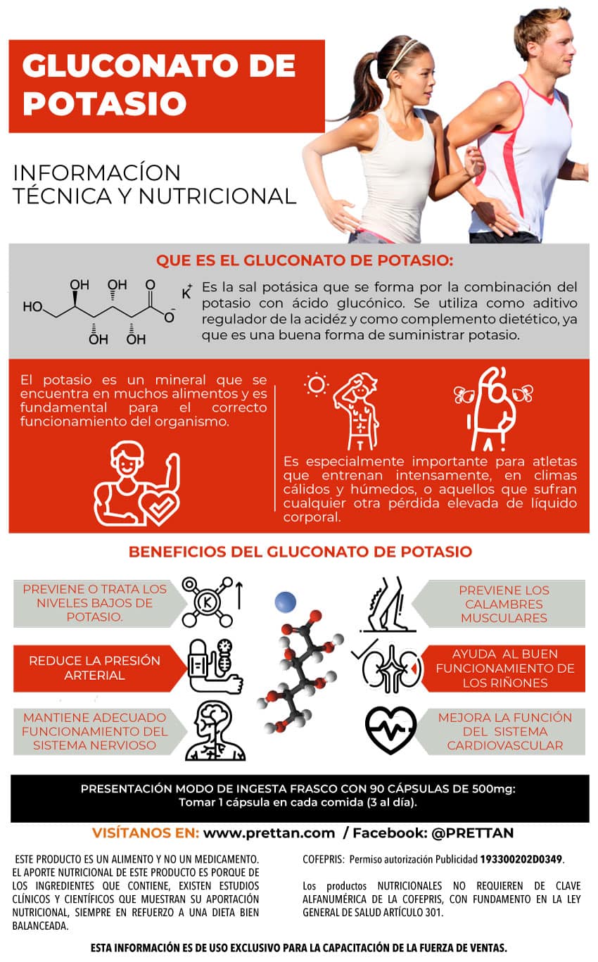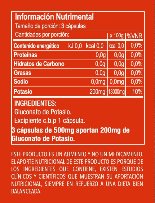 El potasio es uno de los electrolitos principales en el cuerpo humano, portando pequeñas cargas eléctricas positivas a través de la sangre y las células. Juega un papel importante en el mantenimiento de la presión sanguínea, regulando el nivel de pH del cuerpo, manteniendo un balance en el nivel de agua, regulando el ritmo cardíaco y auxiliando a los impulsos neuronales. Además contribuye a la conversión de los alimentos en energía y al crecimiento de las células musculares.