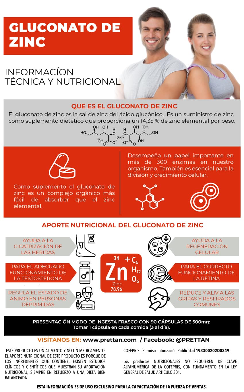 El gluconato zinc es componente de muchas proteínas que intervienen en el crecimiento y reproducción celular, maduración sexual, fertilidad y reproducción; interviene también en la visión nocturna, la respuesta inmunológica, el apetito y el sentido del gusto.