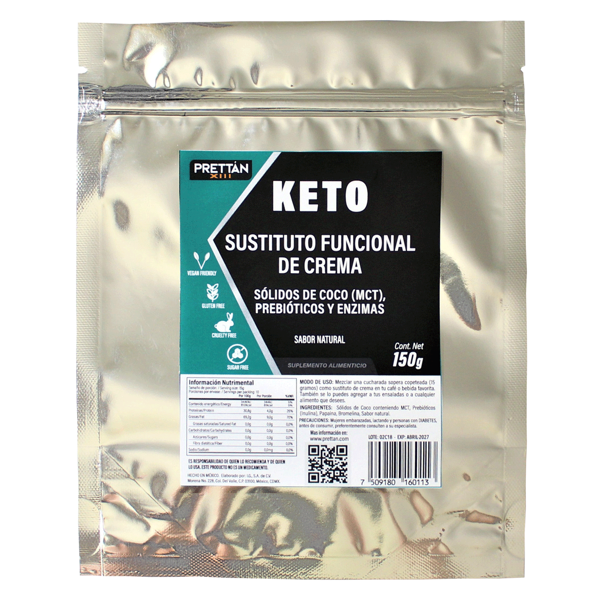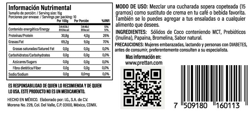 Sólidos de Coco conteniendo MCT, Prebióticos (inulina), Edulcorante Natural extraído de la Manzana y la Uva, sabor natural.